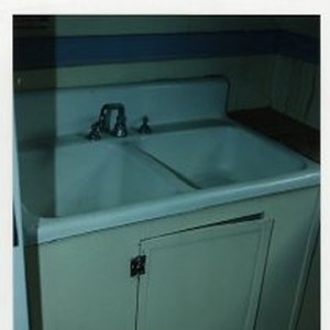Interior view of the Merrium Apartments before demolition showing an enclosed kitchen sink