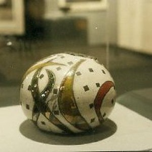 Ceramic sculpture shaped like an egg by artist Laurie Sylvester.