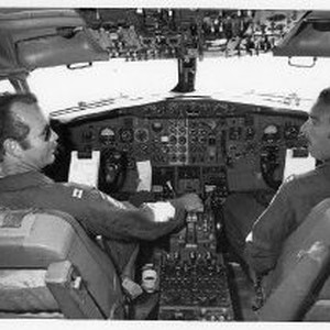 Interior view of the T-43A cockpit with aircraft commanders at the controls. T means Trainer