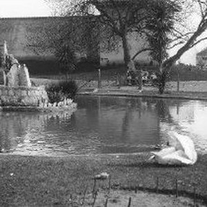 View of the park and lake at Sutter's Fort State Historic Park. Fort in background.