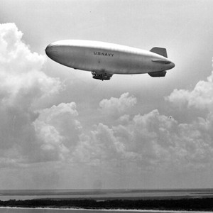Inflight K-type blimp, left front - Title:Array - Image from the Theodore Bolduc collection. Ted enlisted in the Navy at the start of World War II and served as an Aviation Photographer, assigned primarily to "Lighter Than Air" (blimp) squadrons in Georgia and Florida. He married Navy nurse Bernice Fournier, from Waterville, Maine, in 1946.------Please Tag these images so that the information can be permanently stored with the digital file.---Repository: San Diego Air and Space Museum