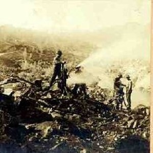 Exterior view of hydraulic mining operation on possibly the Feather River near Oroville, California. Men are seen operating the nozzle and other equipment.