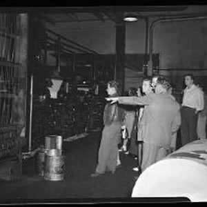 SERIES. Views of group of people being given a tour of the press room and viewing display advertising.