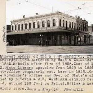 View of southwest corner of 3rd & J St.. Built in 1852 by Read & Co. Bankers, later used as State Library, Post Office, Governor's & Secretary of States offices. Owned by L. Tevis and J.B. Hastings. Also seen in the photo is a bath house and hotel.