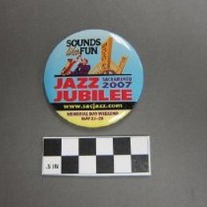 Celluloid pin-back button. Commemorating 2007 Jazz Jubilee. Produced by Buttonworks. "Sounds like fun, Sacramento 2007 Jazz Jubilee, www.sacjazz.com, Memorial Day Weekend May 25-28" w/image of Tower Bridge and man playing saxaphone.
