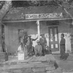 Images taken by employees of U.S. Geological Survey, Sacramento Office. Surveys. "Miller, Jenkins, Knock and the proprietor. Only town on 960 sq. mi. 1906. [Olancha, CA]"