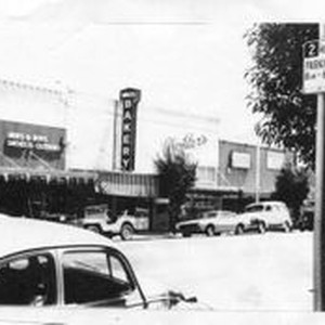 Photo--black and white: East side of North Main Street Sebastopol, late 1960s. Store fronts seen are Jack Clark Clothing, Turley's Bakery Wohler's, Montgomery Wards and the Sebastopol Book Shop.