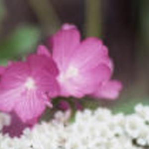 Close-up of two pink flowers above small white flowers.
