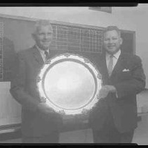 Photograph showing two men holding an engraved silver platter with the legend "Achievements at Braley & Graham Buick 1961." A note states "Salesman of the Month", this would have been for April.