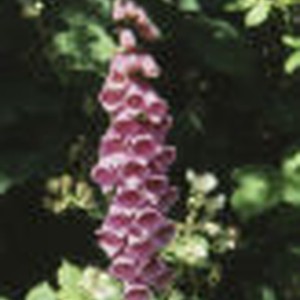 Small pink flowers growing upright on long stem with tiny white flowers and large green leaves in background.