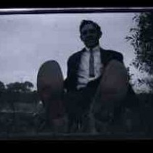 A photographic study of an unidentified young man sitting in a field. View is taken from ground level with the man's shoes in the foreground.