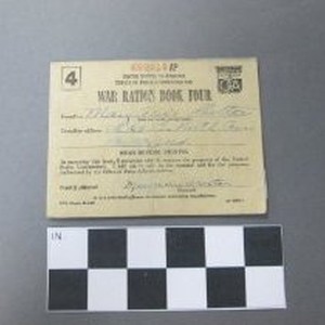 War Ration Book #4, includes several dozen stamps. Issued to Mary Alice Shelton in 1943.