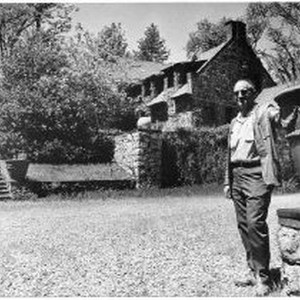 Carl Byer, manager of the Empire Mine properties, stands before the mansion once occupied by Empire Mine owner William B. Bourn Jr.
