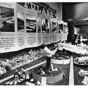 View of Tulare County's exhibit booth at the California State Fair. This was the last fair held at the old fair grounds.