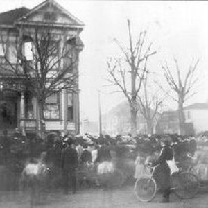Crowd of spectators gathers in front of a Victorian house. Man on steps faces crowd.