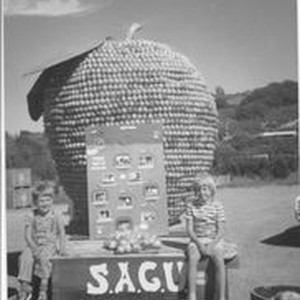 Photo--Black and white: Scott & Carrie Roberts sit on SAGU float for the Gravenstein Apple Fair circa 1972.