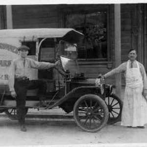 Two men posing out in front of the Weber & Brunner Meat Market at the corner of 11th and H Streets in Sacramento. They stand next to the market's delivery vehicle.