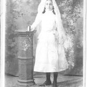 Photo--black and white, cabinet card: Portrait photo of unknown girl in confirmation photo circa 1900. Healy Studio, Ground Floor Gallery, Petaluma, CA.