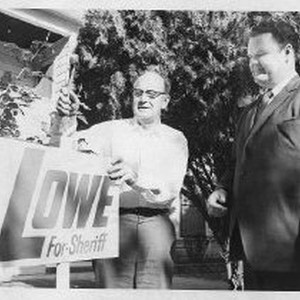 Duane Lowe, Sacramento County Sheriff, 1971-1983; chief of California State Police and then (after merger with CHP) Deputy Chief of California Highway Patrol, through 1996. Here, watching as a supporter (identified only as Dempster) puts up Lowe for Sheriff lawn sign.