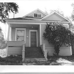 Photo, black and white: Sebastopol house at 306 Pitt Avenue, a Queen Anne cottage built in 1905 in the Morris Addition. House photographed in 1993 by Evelyn McClure for her book "Sebastopol, California : History, Homes and People."