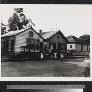 View of houses with automobiles and children in the street on Avila Street near Old Chinatown in Los Angeles. Title transcribed from photograph. "Get house numbers"--handwritten note, in pencil, top-right margin.