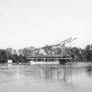View of a steel bridge sitting on a barge while under construction. A tug boat pulls it downriver.
