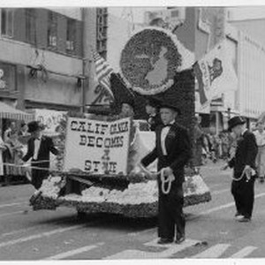 Exterior view of a float moving down the street for the Camellia Festival Parade. Young boys dressed in tuxedos assist the float.