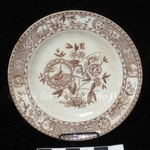 Dinner plate of white glazed ceramic with brown floral and geometric pattern. Pattern includes a sailing ship.