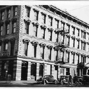 4th and J Street. Information on back: Southeast corner of 4th and J Street, "Old Dawson House" offices of state and federal departments, erected in 1856.