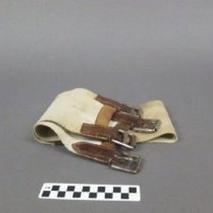 Cinch (strap), cotton webbing and metal, 12 cm x 122 cm. Two metal buckles attached at each end of cinch strap by stitched leather strips 2.5 cm x 14 cm.