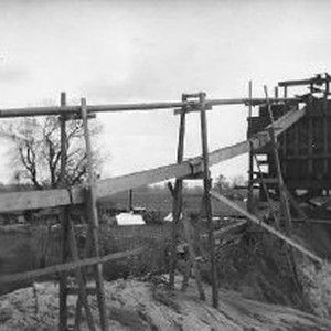 View of dredging equipment with sand from river piled below. Sand probably used for fill.