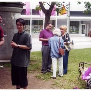 Fotografija Mihaela Kuzmiča i nekolicine studenata teologije u razgovoru s ljudima u parku. [Description (original non-English/roman language/script)] Photograph of Mihael Kuzmič and a few students of theology talking with people in a park. [Description English/roman)]