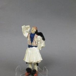 Doll wearing Greek national costume comprised of white cotton and linen with blue yarn. Cotton body with painted facial features. Arm raised in dancing position.