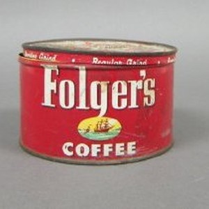 Red tin coffee can, cylindrical in shape, white reads "Folger's Coffee." Also featured is a small drawing of a ship with blue water and yellow sky in the shape of an oval. Lid does not fit snugly.
