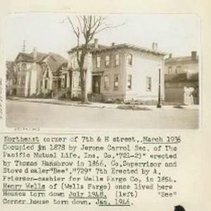 View of the northeast corner of 7th & H. Shown are 721, 723, 729. Houses were torn down in 1946 & 1948.