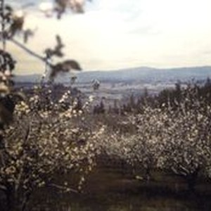 Photo--color, mounted: Panorama view looking east of an apple orchard in bloom near Sebastopol.