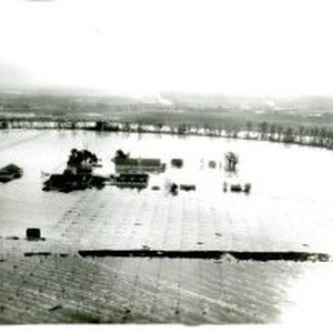 Print, 4" x 5". Depicts flooding along the American River in North Sacramento/Gardenland. "Ranch near North Sacto" written on reverse. Aerial shot.
