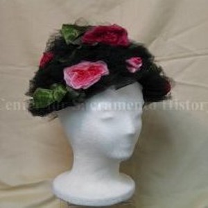 Women's stiff black net bucket hat without brim. Covered with black tulle and silk roses and leaves. Label: "Patrice."