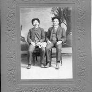 Photo--black and white: The Peterson boys, Glen (1875-1944) and one of his unidentified brothers, about 1895. The Peterson boys were children of Ludencia Cordellia Sebring Peterson and Andrew Jackson Peterson and grandchildren of Margaret & Thomas Sebring. Photo by N. R. Davidson of Santa Rosa, CA.
