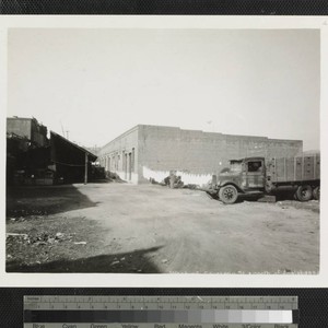 View of a dirt lot and an alley with a brick building and some wooden sheds west of Cayetano Street and north of Apablasa Street in Old Chinatown, Los Angeles. A truck is parked in the foreground and laundry is hung in front of the brick building. Title transcribed from photograph. Note: The street name of "Apalabassa" is spelled incorrectly on the photograph, the correct spelling is "Apablasa".