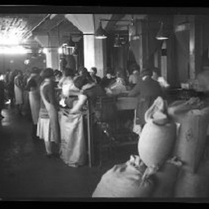 View of a section of the sorting tables used in sorting almonds.