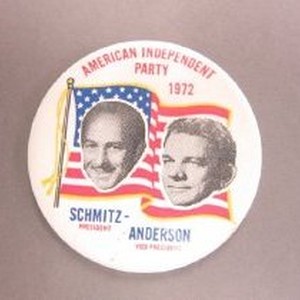 Red text on white background. "American Intependent Party 1972 Schmitz-President Anderson-Vice President" w/photos of John Schmitz and Thomas Anderson w/flag background.