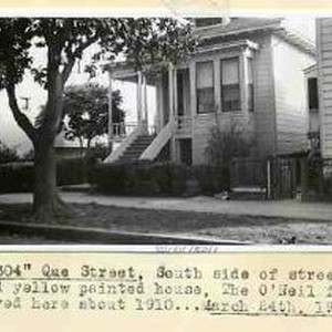 Typed on binder page "1304 Que Street, South side of street. Old yellow painted house, The O'Neil family lived here about 1910..March 24th, 1952."