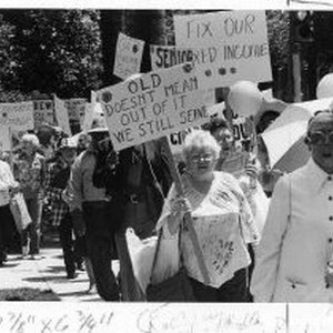 Older demonstrators march at the California State Capitol to protest cuts in state and federal social programs. High resolution scan available.
