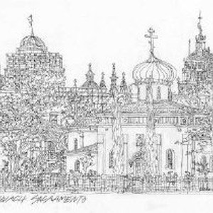 Original pen and ink drawing of the Russian Orthodox Church in Sacramento