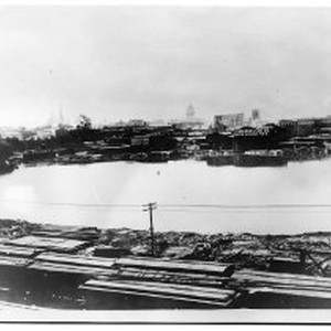 Copy print of the "China Slough" or "Sutter Lake" as it was called before being filled in to make room for the new Southern Pacific Depot between 5th and 6th Streets at I Street, which ran parallel to the slough. Note John Breuner furniture company's warehouse No. 3 in the background. The state capitol building can be seen in the distance.