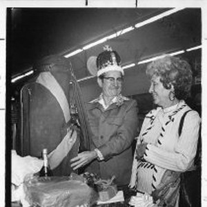 Cy Lemonds, a longtime clerk at Compton's Market on McKinley Blvd., holds his new golf bag at a retirement party thrown by area residents as wife Helen looks on behind a table laden with gifts.