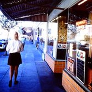 Slide--color: Business along North Main Street of Sebastopol. Newmeyer's Bakery is seen in the background. 1970