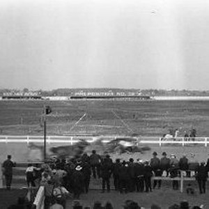 Spectators gather near the track to watch the harness racing. Image taken from the fair grandstand. Across the infield are three buildings with their roofs painted with a political advertisement: VOTE YES STATE FAIR BONDS PROPOSITION NO. 37; a locomotive sits in the infield.