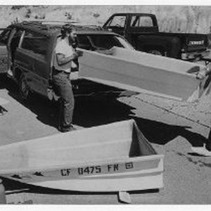Bob Grind (left) taking part of a boat from a station wagon, with unidentified man
